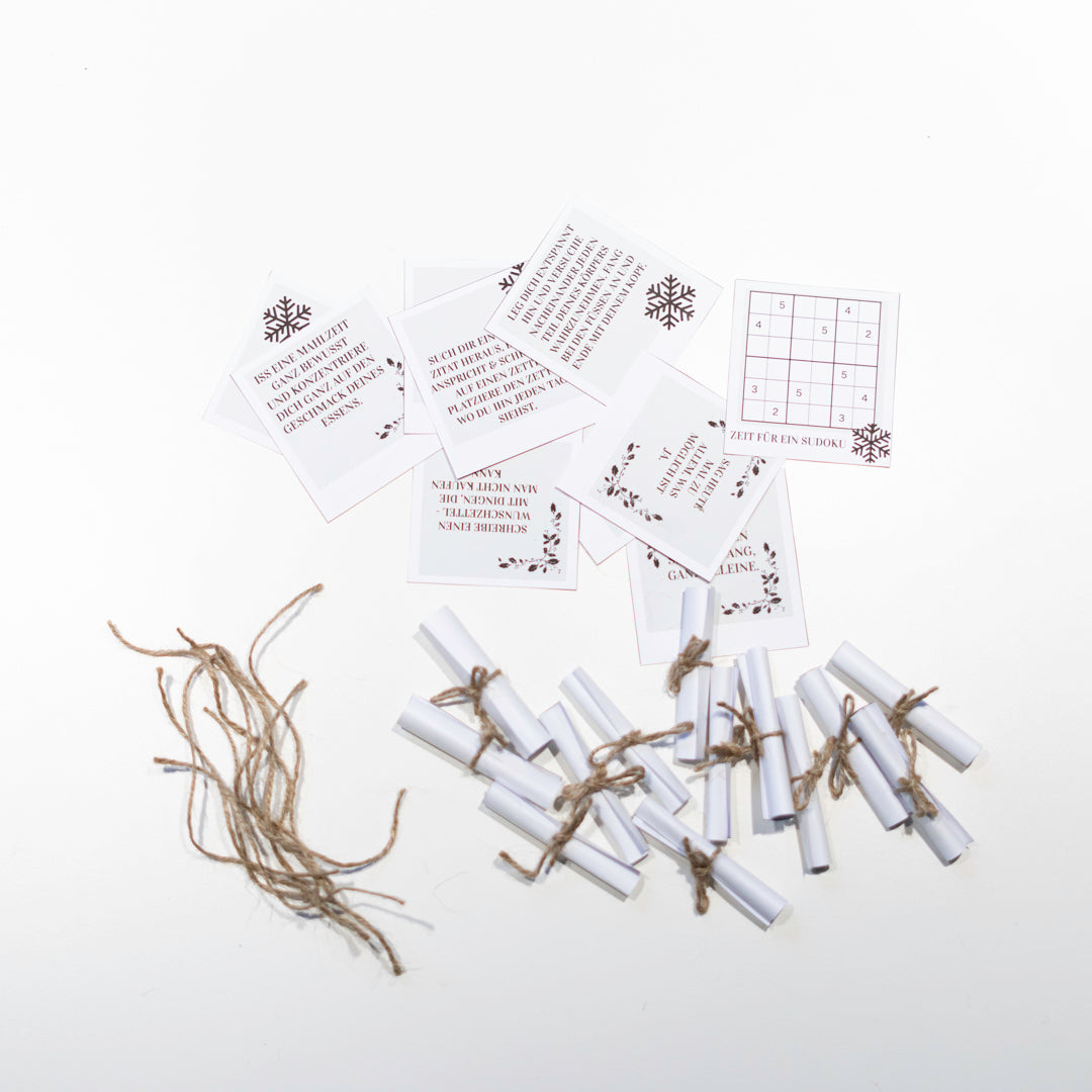 Wir füllen ihn mit kleinen Botschaften für einen guten Start in den Tag. Erlaubt ist alles, was gefällt und worüber sich der oder die Beschenkte freut. Für die unter euch, die schon im tiefsten Vor-Weihnachtsstress stecken, haben wir hier auch eine bereits ausgefüllte Vorlage mit kleinen Botschaften für 24 Türchen vorbereitet.
