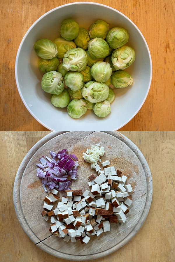 Pour cette recette, nous devons aller un peu plus loin : hier, nous nous sommes retrouvés avec un panier contenant 50 % de produits dans notre supermarché local - des produits qui n'ont plus l'air particulièrement beaux, mais qui ont quand même un goût délicieux. Et il y avait ces choux de Bruxelles de couleur foncée. Comme prévu, il suffisait de retirer les feuilles extérieures pour découvrir le bel intérieur vert du petit légume. Il fallait donc une recette rapide pour traiter les choux de Bruxelles le plus rapidement possible. Cette recette de tofu fumé s'apparente aux recettes traditionnelles de chou avec du jambon ou des saucisses. Cependant, cette recette de pâtes est végétalienne :)